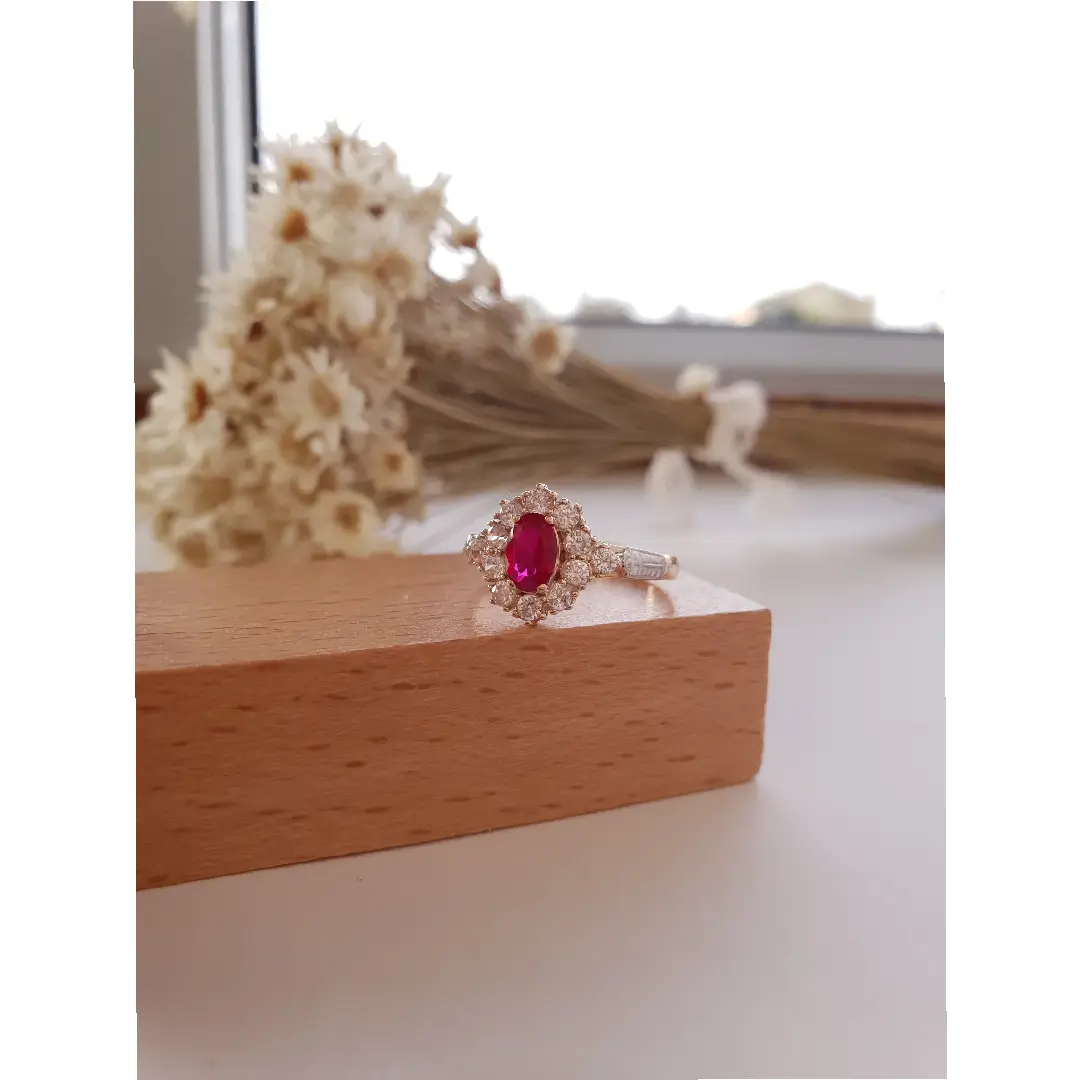 Pedra central: Rubi sintético oval com 4mm por 6mm.