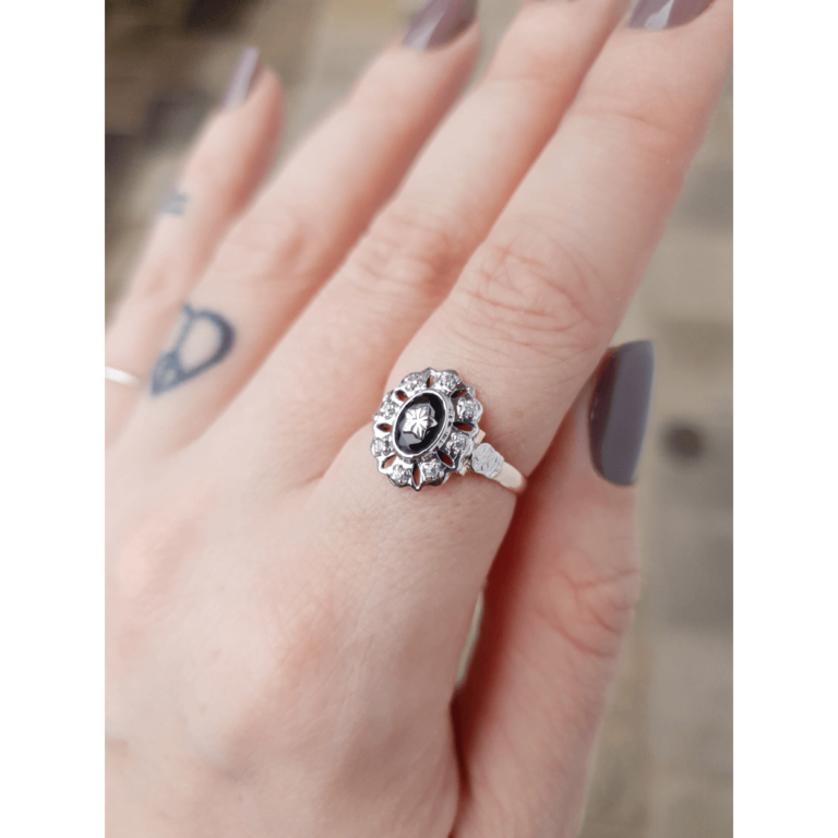 Pedra central: Ônix oval com 7mm por 9mm e estrela em ouro branco.